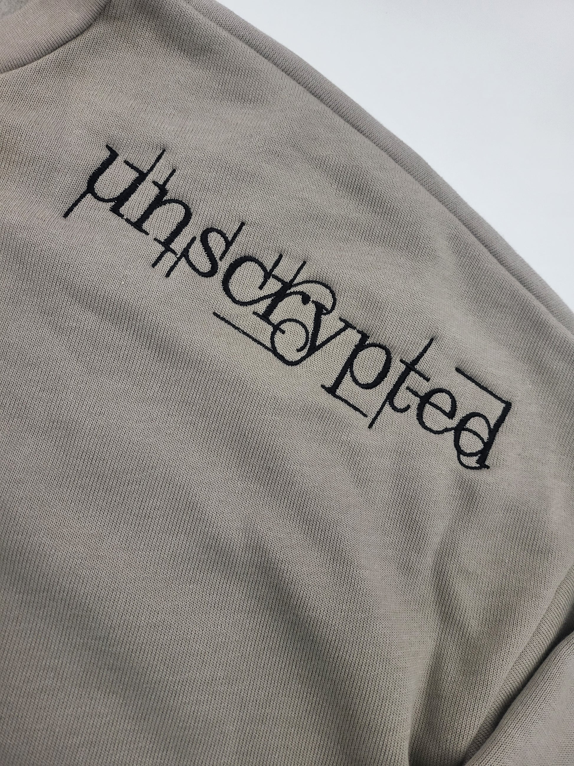 Unscrypted is in 3D Embroidery on the upper left part of the crewneck and the book logo is in 2D Embroidery on the left back shoulder of the crewneck.