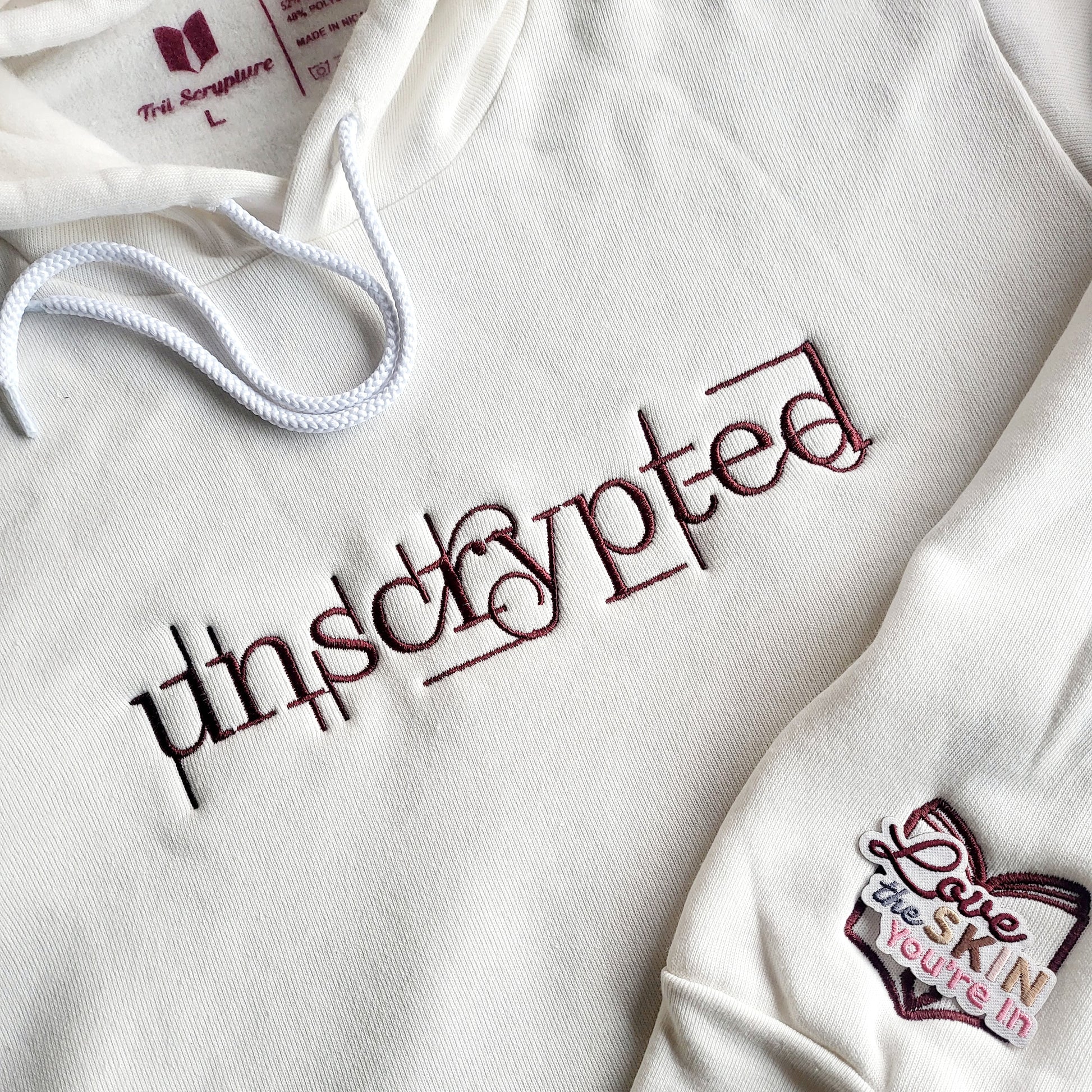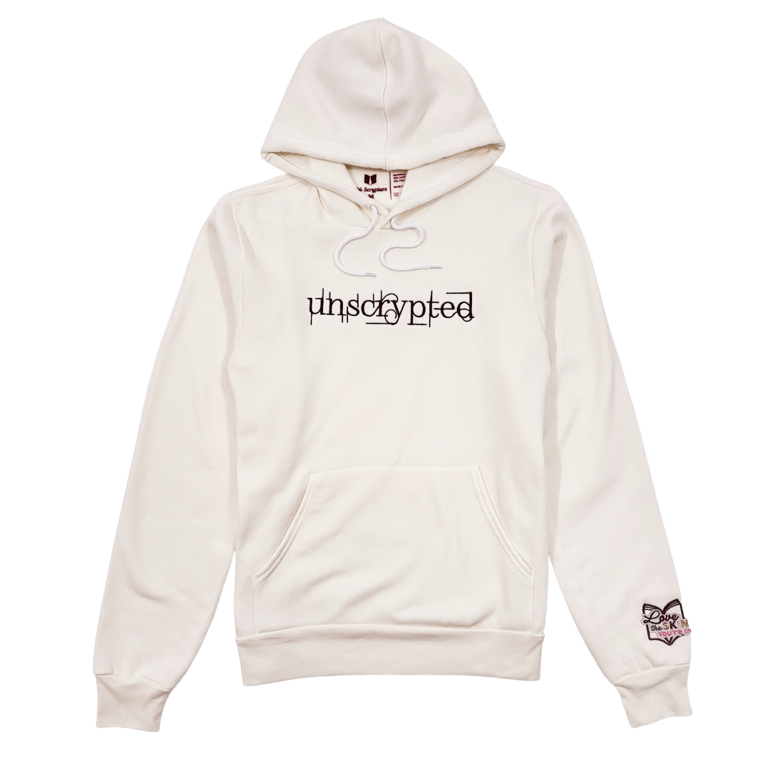 The Unscrypted wording is in 3D Embroidery on the chest and the book logo is in 2D Embroidery on the sleeve of the crewneck. There is an embroidered "Love The Skin You're In" embroidered patch which lies over the fashion book.